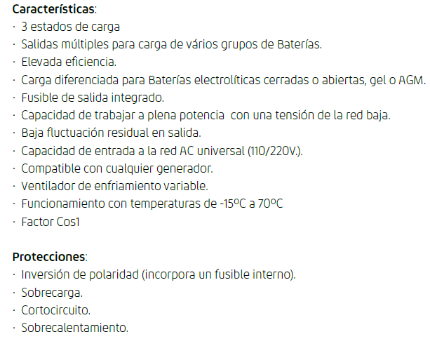 • Carga diferenciada para Baterías electrolíticas cerradas o abiertas, gel o AGM.