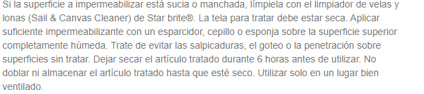 Impermeabilizante con Teflon que ayuda a proteger y prevenir el moho , podredumbre .Sin peligro para cualquier tipo de tejido incluyendo Sunbrella ®, para carpas de barco, toldillas, fundas de vela, toldos y lonas. No altera el color ni el tacto del tejido, ni textura de la tela... Envase : 650ml.