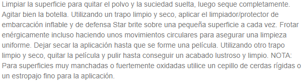 Limpiador protector para embarcaciones neumáticas, defensas. Puede utilizarse en todas las superficies de Hypalon, PVC , fibra de vidrio, plástico, caucho y vinilo. Fórmula de alto rendimiento elimina la suciedad, la mugre, los roces como pequeños arañazos y las manchas de oxidación. Sin peligro para cualquier superficie de caucho gomoa o vinilo. Deja una capa protectora resistente. El modo más rápido y sencillo de cuidar los neumáticos y las defensas de barco. Protege contra los rayos solares dañinos. Gracias a su sistema pulverizador obtenemos una forma rápida y comoda de limpiar. Envase: 1 L