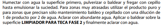 MINEA LIMPIADOR PARA TECA FASE 2.- Es un producto ácido diseñado para eliminar la suciedad atrasada y la producida por la contaminación atmosférica, efecto del medio salino, restos orgánicos y grasientos, en cubiertas de teca y tablero marino. Biodegradable. Ideal para trabajos de baldeo, limpieza y recuperación sobre cubiertas de teca y tablero marino. RESPETA LAS BANDAS DE SICAFLEX. En caso de duda probar antes el producto en una pequeña parte de la superficie a tratar. Envase: 1L