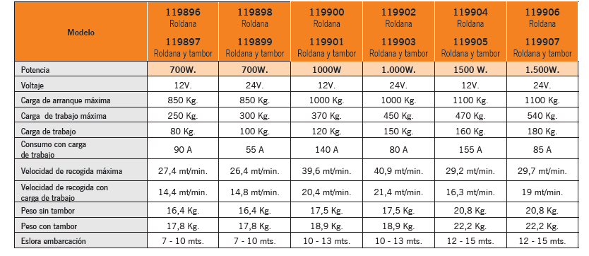 • Potencias: 700, 1000 y 1.500W. Voltaje: 12 y 24V. • Base de aluminio anodizado en óxido duro. • Dispone con tambor para cabo. • Funciona con cabo y cadena con una unica roldana gracias a su pestaña guia-cabo. • Equipado con iman y sensor para la instalación del cuentametros de cadena. • Sistema manual de caida libre de la cadena. • Sistema de recuperación manual de emergencia. • Tapa de inspección del tragacadena. • Motor estanco IP67. • Reductor de aluminio anodizado. • Equipamiento de serie : Incluye caja de reles,interruptor de subida/bajada y maneta de aluminio. • Soporta cadena de 8 y 10mm. DIN766. Los modelos de 700 y 1.000W. llevan instalada la roldana de 8mm., el modelo de 1.500W. la de 10mm. • En caso de desear un roldana diferente a la que viene equipada de serie avise al realizar el pedido.