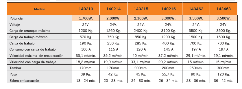 • Potencia: 1700, 2000, 2300, 3000 y 3500W. Voltaje: 24V. • Molinete de maniobras. • Base y tambor de acero inoxidable AISI316. • Motor estanco IP67 (1700W) IP66 (2000-2300W) excepto 3000 y 3500W. • Equipamiento de serie: Incluye caja de relés, interruptor de subida/bajada y maneta de plástico. • Reductor de aluminio anodizado. • El modelo de 3.500W. permite instalar el tambor de 250mm. ó 300mm.