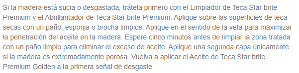 El producto Teak cleaner & Brightener es un limpiador y abrillantador para maderas de teca en un solo envase. Su fórmula biodegradable . No contiene fosfatos ni acidos fuertes. Es ideal para cualquier tipo de madera. Envase : 1L