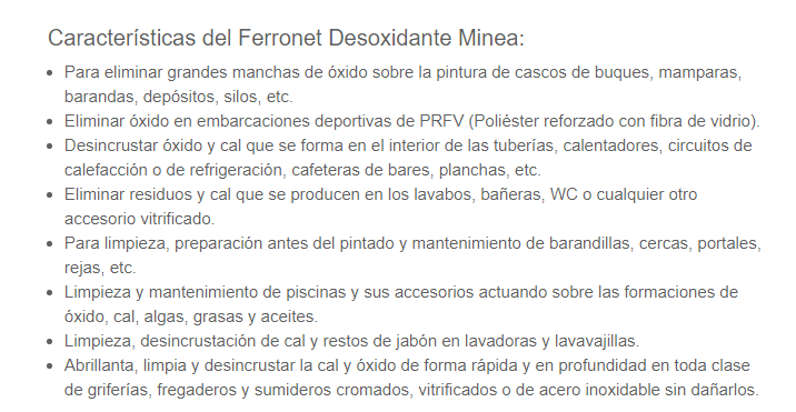 Desoxidante de a bordo Ferronet Minea es un producto para eliminar el óxido de superficies metálicas así como en superficies no metálicas (madera, poliéster, esmaltados, etc.) teñidas por el óxido de hierro procedente de oxidaciones que pueden estar en contacto con ellas. además de enérgico desengrasante y descalcificante.No es inflamable.Elevado poder desincrustante de los residuos calcáreos. Eficaz como eliminador de óxido. Soluble totalmente en agua en todas proporciones. Eficaz a cualquier temperatura, aunque su rendimiento aumenta trabajando en caliente. No ataca a metales como hierro o cobre, pudiendo atacar débilmente metales ligeros como aluminio, zinc, o estaño cuando no están en aleación.Puede atacar a las superficies pintadas (especialmente si son viejas) quitándolas brillo o incluso variar el color de la pintura. No aplicar en superficies brillantes de metales ligeros (aluminio, zinc, etc.) ya que puede matizarlas. Minea Ferronet es perfecto para eliminar el óxido en metales de barcos y veleros pero también en todo tipo de vehículos y furgonetas. Se trata de uno de los limpiadores de óxido más efectivos que existen en el mercado. Envase : 750ml SPRAY