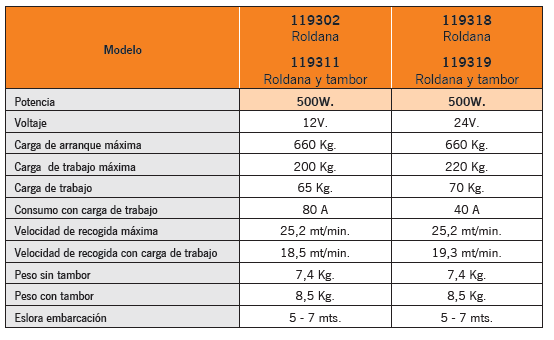 Molinetes eléctricos para maniobras de anclas. Base circular de aluminio anodizado. Eje de acero inoxidable AISI 316, roldana en bronce cromado. Equipados con roldana única que acepta por continuidad el paso de cabo a cadena automáticamente. Todos los modelos se suministran con caja de relés y panel interruptor de subida/bajada y maneta. Están provistos de una protección IP 67 que asegura la estanqueidad del motor. Recomendado para embarcaciones de 6-9 m. • Potencia: 500, 700, 1000 y 1400W. Voltaje: 12 y 24V. • Disponible con y sin tambor para cabo. • Equipado con imán y sensor para la instalación del cuentametros de cadena. • Sistema manual de caída libre de la cadena. • Reductor de aluminio anodizado. • El modelo de 500W.soporta únicamente roldana para cadena de 6mm.DIN766.Los modelos de 700, 1000 y 1400W. Soportan cadena de 8 y 10mm.DIN766. • Los modelos de 700 y 1.000W. llevan instalada la roldana de 8mm. Y el de 1400W. La de 10mm. En caso que desee una roldana diferente a la instalada de serie indique lo al realizar el pedido.