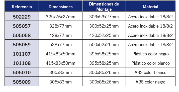 Dimensiones montaje 500x52x25mm. Fabricado en acero inoxidable 18/8/2.